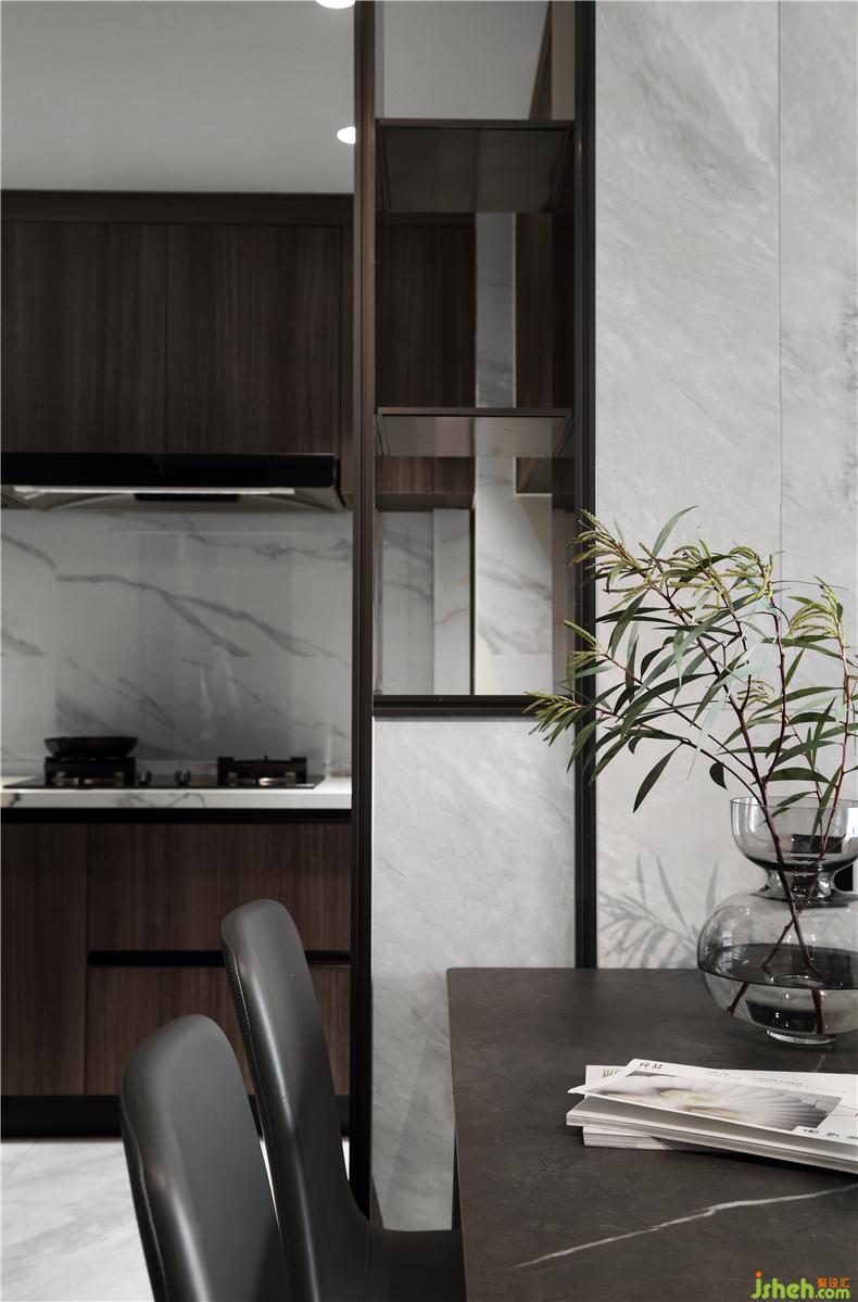 餐廳與廚房之間的開放式門洞做成展示架樣式,供屋主擺放相框紅酒等物品,用生活為設(shè)計加碼。