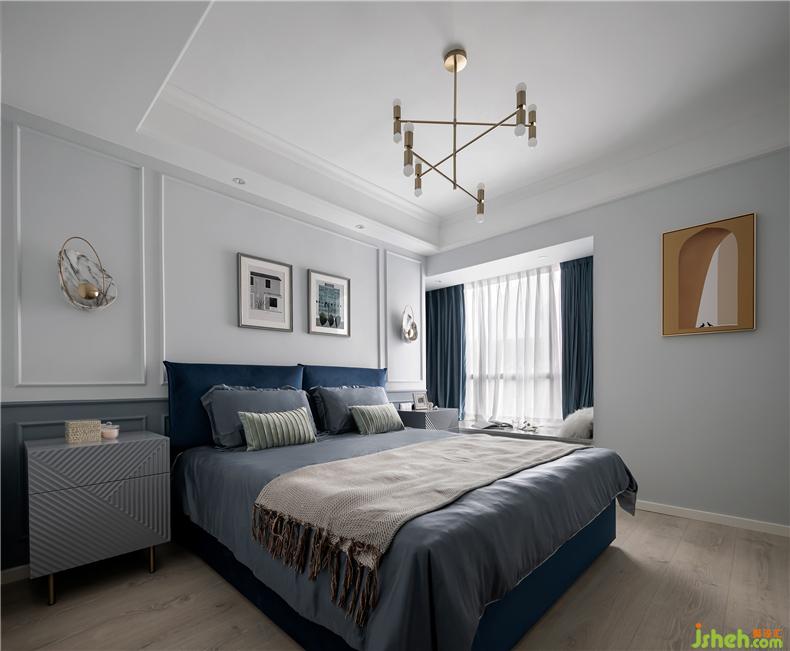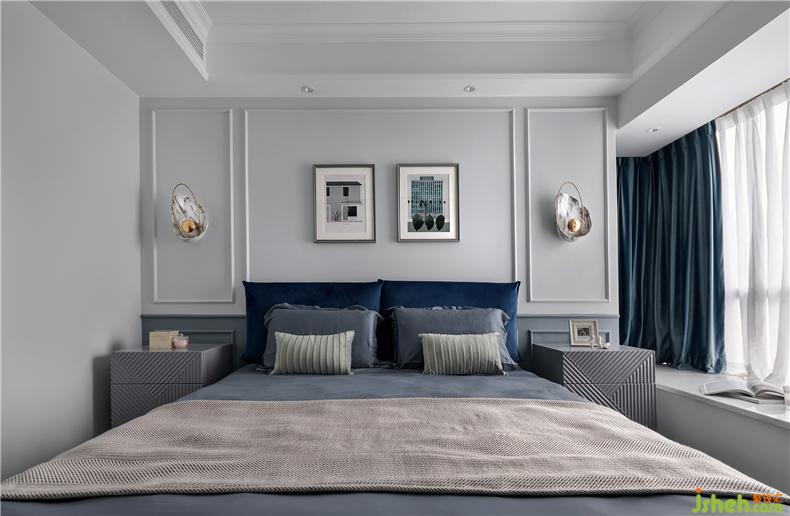 主臥運(yùn)用了多種深淺不同的藍(lán)色系,將靜謐舒適的尺度拿捏的剛好,不會(huì)過于單調(diào),也不會(huì)過于繁瑣