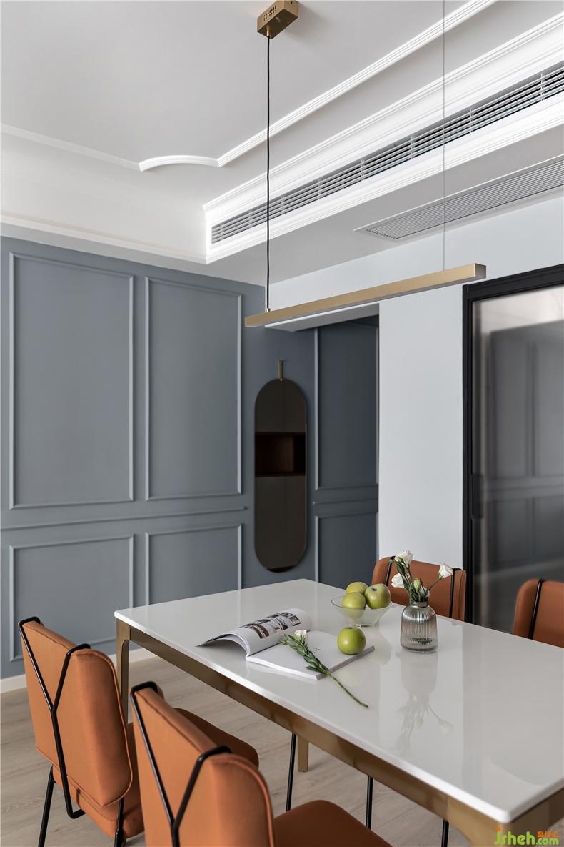 客廳的墻面設(shè)計(jì)延伸至餐廳,兩個(gè)空間的聯(lián)系更為緊密,靠近玄關(guān)過道處安放了一面穿衣鏡,方便屋主出行前整理妝發(fā),鏡身圓潤的曲線輪廓和墻面形成互補(bǔ),讓過道處的視覺效果更加通透舒適。