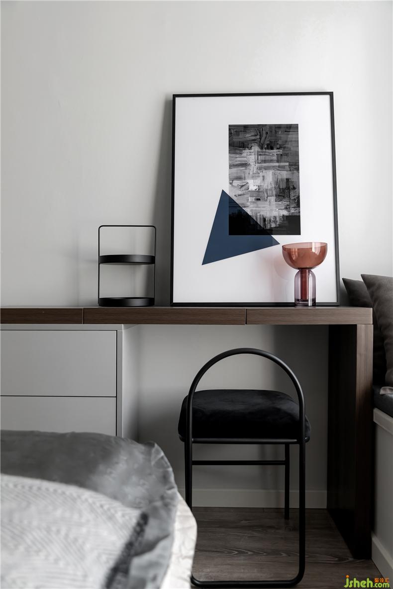 臥室硬裝以簡為主,色彩也是低飽和度的灰色,旨在營造輕松易眠的休息場所,床頭用了皮質(zhì)軟包,材質(zhì)和卡其色剛好中和了空間的硬朗。