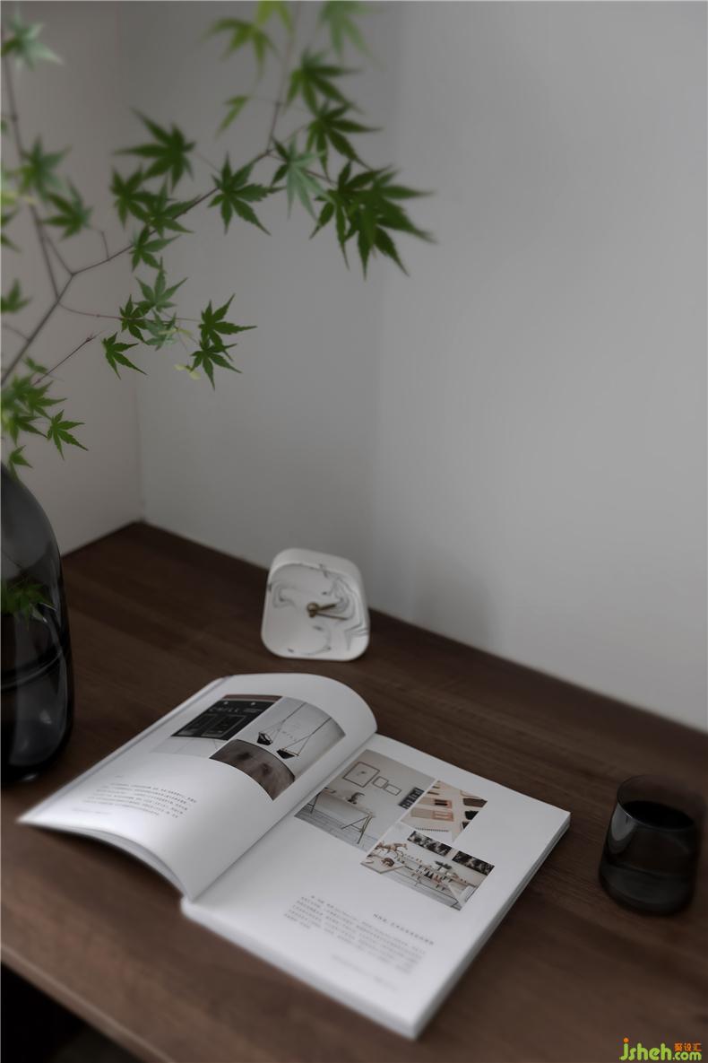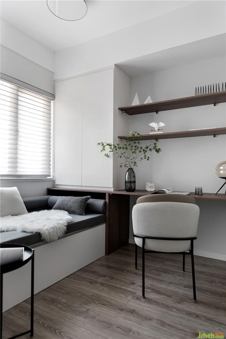 書桌與柜體相連,設(shè)計(jì)幾塊隔板,不僅可以增加收納空間,視覺效果上也更加輕盈。