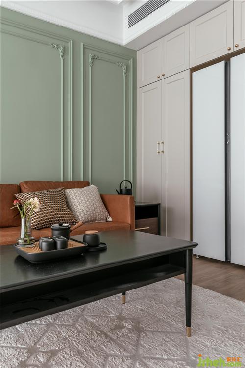 屋主是潮汕人,喜愛喝茶,精選黑色實(shí)木茶幾,造型大氣,觸手升溫,兼做茶桌,配以整套功夫茶茶具,古拙禪意的飲茶氛圍,令空間平添幾分溫厚。