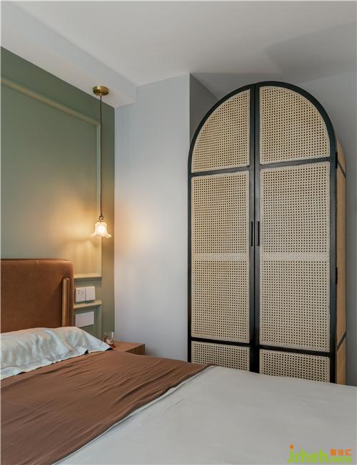 房間墻面采用PU線條和莫蘭迪綠色墻漆,搭配黑色鐵藝家具,拱形衣柜、暖色光源壁燈,營(yíng)造出溫暖的光影氛圍。