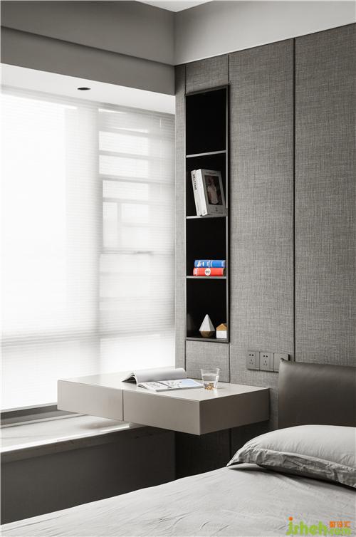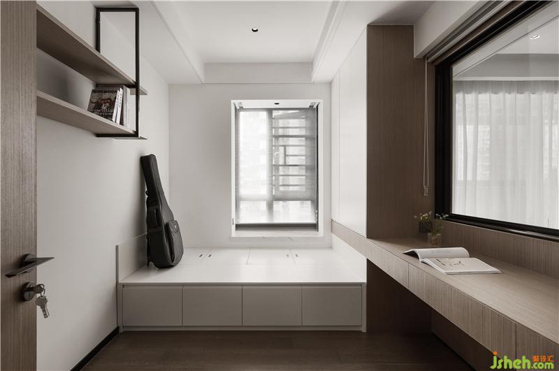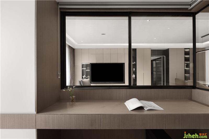 窗前設(shè)置懸空的書桌,拉下窗簾,可靜心伏案工作;疲乏了,拉開窗簾可看會電視,放松身心。