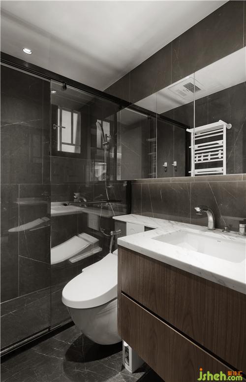 公衛(wèi)面積不大,但仍設(shè)置單獨淋浴房,實現(xiàn)干濕分離,黑色紋路大理石地磚,與純白的衛(wèi)浴用具,顏色對比鮮明,放大視覺空間。