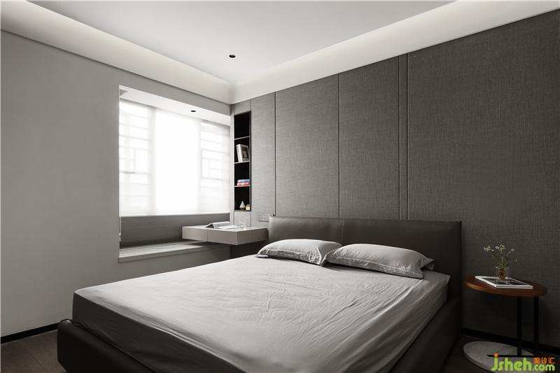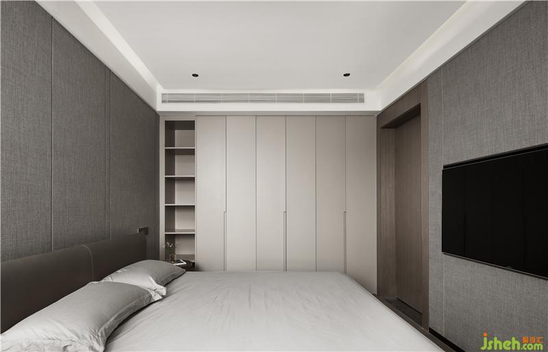 主臥以高級灰為主色調(diào),營造靜謐入睡氛圍。兩側(cè)墻面均選用灰色棉麻墻咔,提升質(zhì)感。按壓式衣柜與墻體深度融合,空間開闊而規(guī)整。