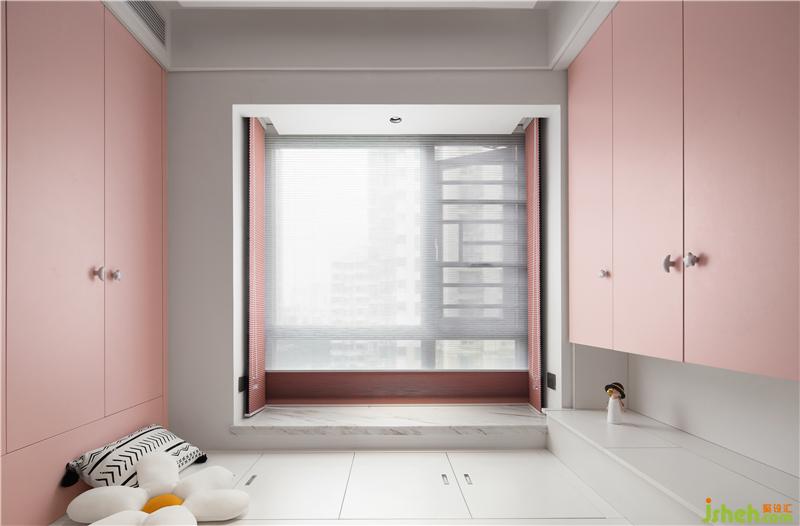 兒童房內(nèi),夢幻的粉色與純潔的白色,默契對話,純真的少女氣息撲面而來,大面玻璃窗,令室內(nèi)明亮清爽,榻榻米的設(shè)計,再一次擴大儲物空間。