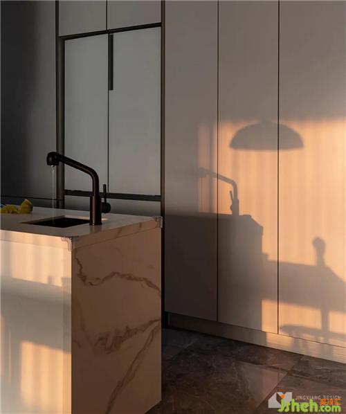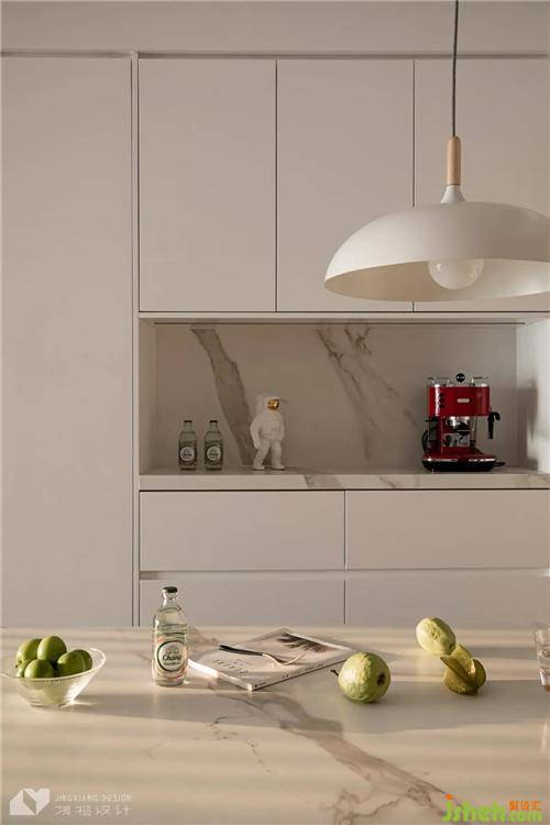 U型廚房優(yōu)化生活動線。根據(jù)梁體合理布置整面儲物柜,掩蓋空間缺陷,視覺上更加統(tǒng)一。島臺采用大理石材質(zhì),既可做水吧臺,深圳室內(nèi)設(shè)計師也能做西廚處理冷食。