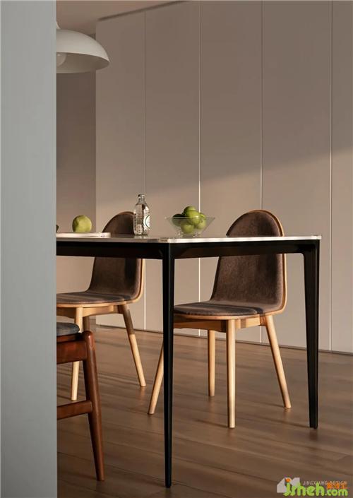 黑白配色餐桌和木質(zhì)餐椅的搭配,與空間整體風格自然融合,餐椅上的灰色坐墊,沉淀出空間的穩(wěn)重質(zhì)感。
