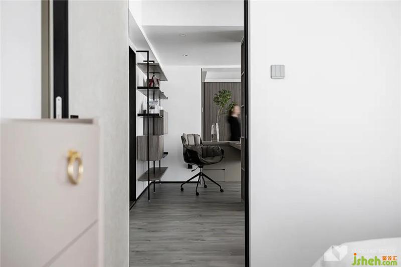 利用L型書桌,巧妙劃分出空間界線,營造書房私密感。開放式書柜,造型輕盈,與開放格局深度融合,形成整體感。