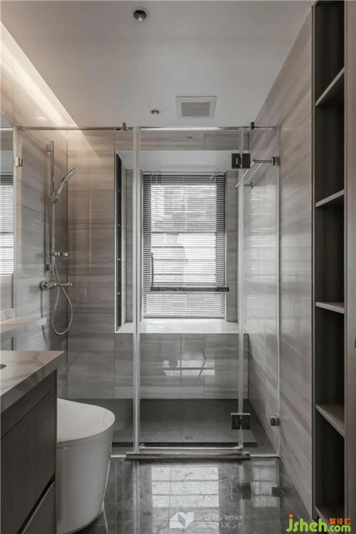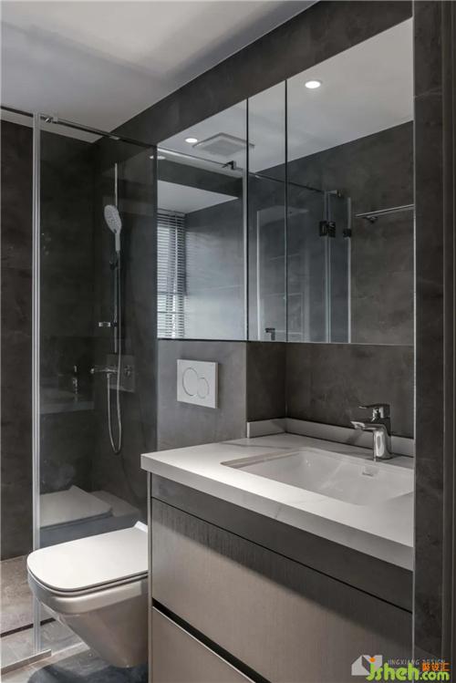 The dark color is the public bathroom, which contrasts sharply with the pure white bathroom appliances, which is stable and generous. The bay window is designed as an alcove, and the corner space can be used perfectly.