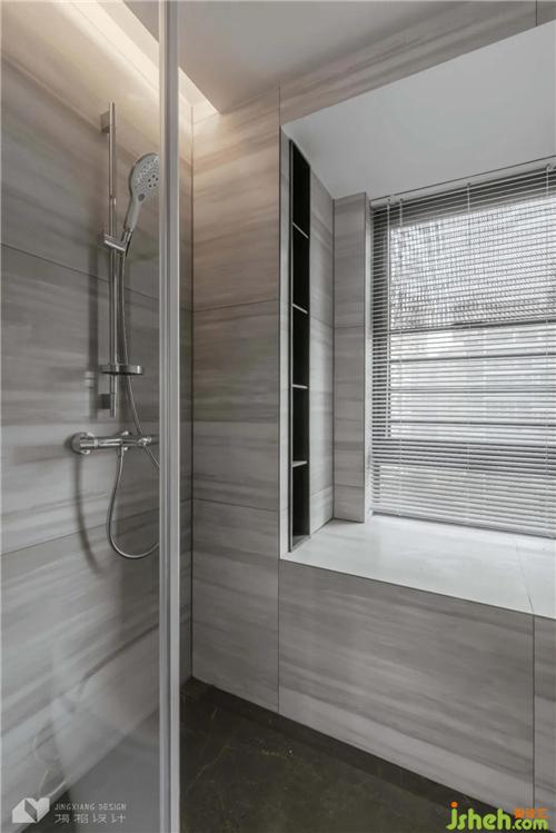 深色系公衛(wèi),與純白衛(wèi)浴用具對(duì)比鮮明,更顯穩(wěn)重大方。飄窗設(shè)計(jì)壁龕,犄角空間得以完美利用。