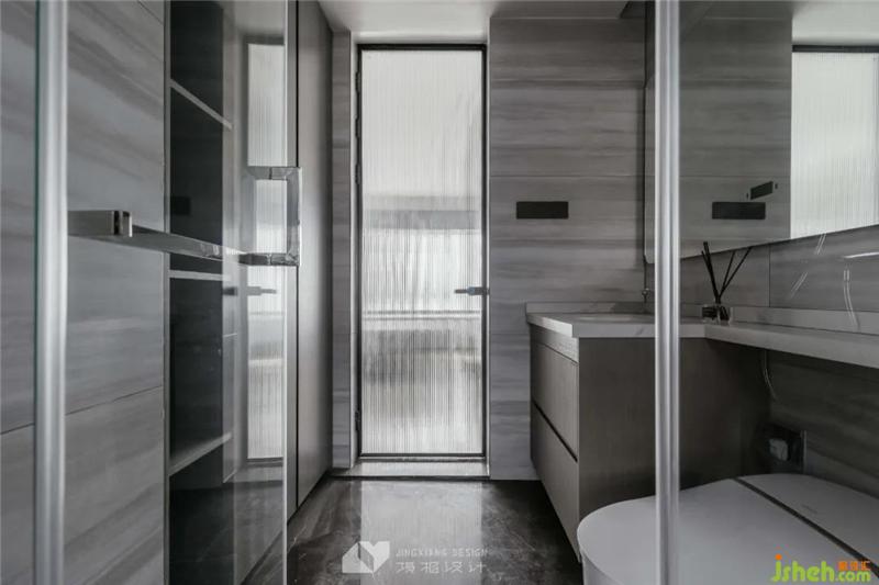 主衛(wèi)、公衛(wèi)對(duì)稱布局,追求統(tǒng)一調(diào)性。主衛(wèi)布置為淺色,大面LED浴室鏡,強(qiáng)調(diào)專屬感。