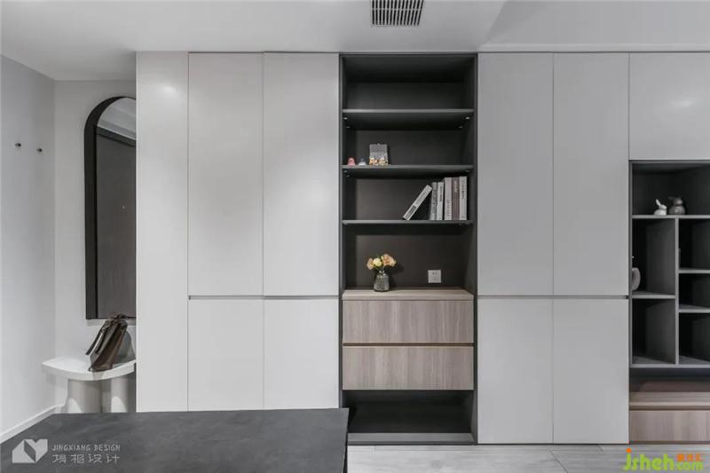 1. 定制儲物柜從玄關(guān)延伸至客廳,增加收納空間,同時保證視覺統(tǒng)一。
