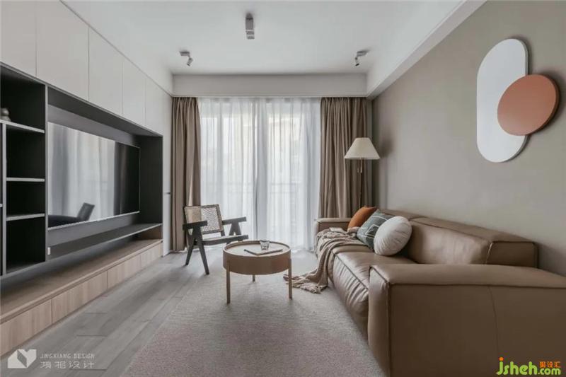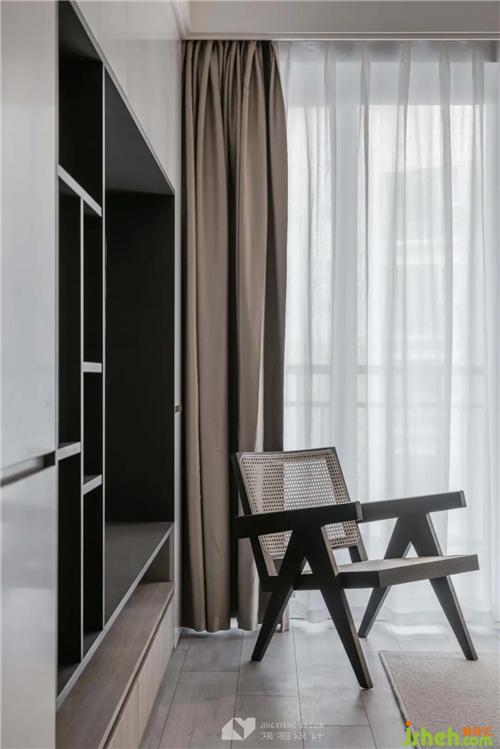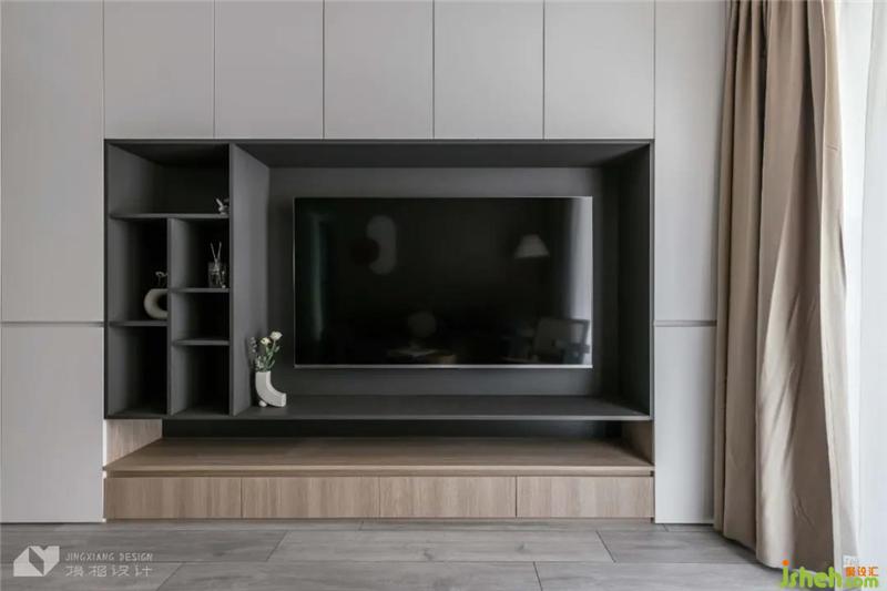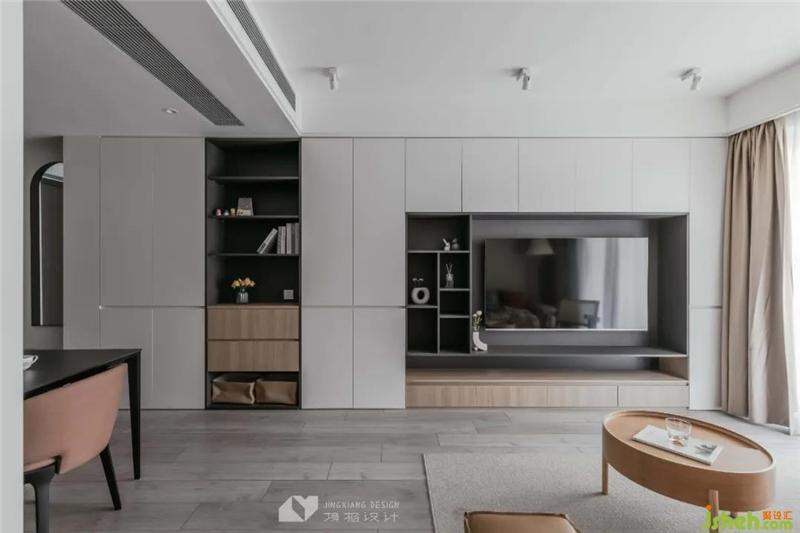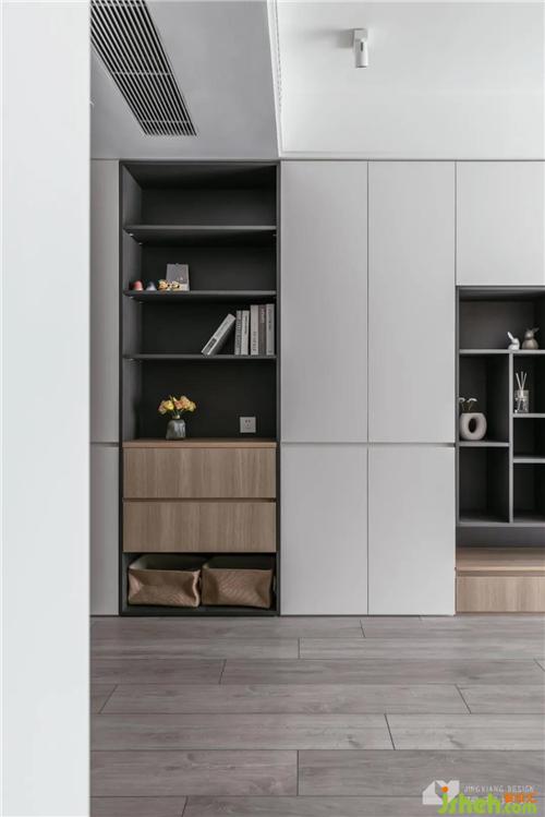 The storage cabinet with the combination of collection and dew extends from the porch to the living room, which can show the surrounding area of the team that the male owner treasures, and also leave space for the female owner's leisure interest in arranging flowers and reading books. The cabinet is made with an open lattice and hidden into the TV, which is more unified visually.