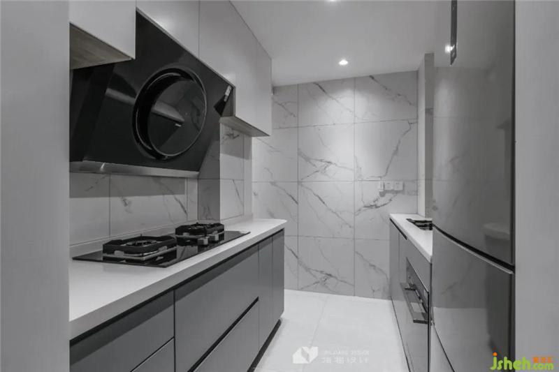 生活不止裝飾,還有務實,廚房借用相鄰陽臺空間,布置出L形,留給屋主更多的烹飪空間,黑白灰的配色務實為主,減輕打掃的負擔。