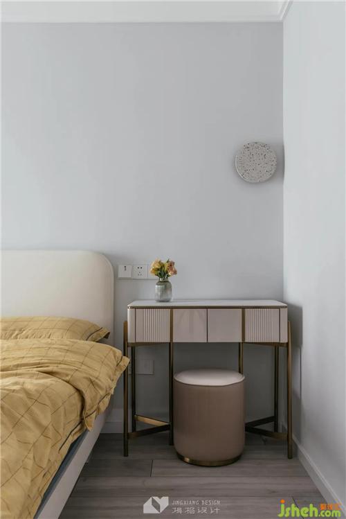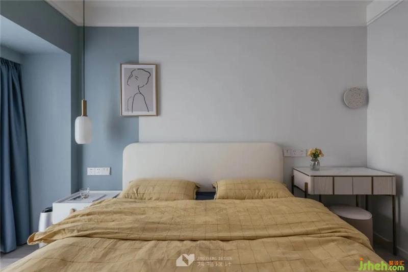 純凈白+霧霾藍的拼色背景墻,深圳裝修設計營造出朗闊又溫馨的臥室氛圍,淡黃色床具,仿若把陽光蓋在身上,讓屋主每一天都有好睡眠。藍色窗簾與墻色相呼應,周末睡個懶覺,厚厚的簾布也能保證屋主不被陽光打擾,拉開窗簾,布體重疊間,窗簾成為臥室天然的裙擺。