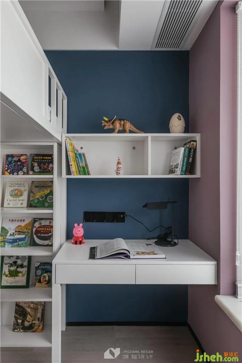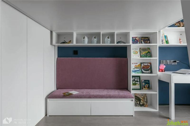 床與陽(yáng)臺(tái)隔墻夾角搭出書桌書架,成為孩子的學(xué)習(xí)一角。靜謐藍(lán)與夢(mèng)幻粉將孩子的童趣融入空間設(shè)計(jì),白色調(diào)和下空間有了更多可解讀的內(nèi)容。