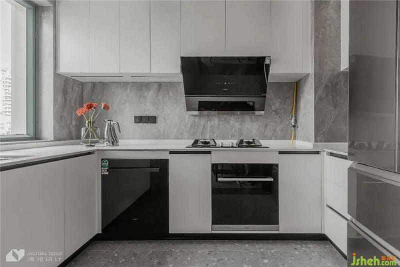 U形廚房布置契合烹飪動(dòng)線,黑白簡(jiǎn)約色調(diào),顏值不落,實(shí)用性不減。開火做飯,煎炒烹炸打破黑白灰的單調(diào)冷寂。