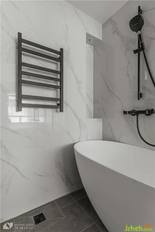 淋浴區(qū)瓷磚在地漏處貼出坡度,水流更加順暢,沒有積水煩惱。承重墻上開鑿壁龕,與浴缸搭配,泡澡物品隨手拿放,熱氣蒸騰中消去一身疲乏,靜享歲月美好。