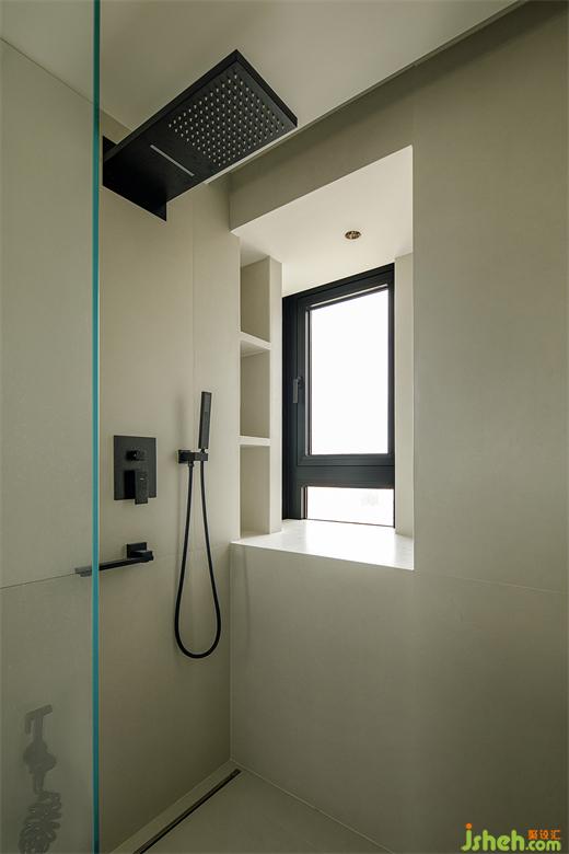主衛(wèi)均出一點(diǎn)空間給玄關(guān)區(qū),利用飄窗臺(tái)做洗漱臺(tái),做成三分離。