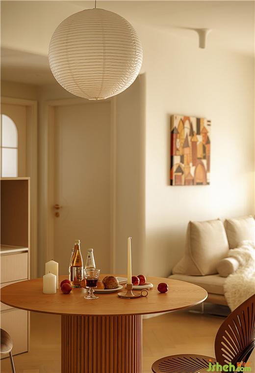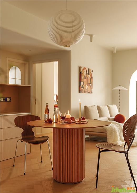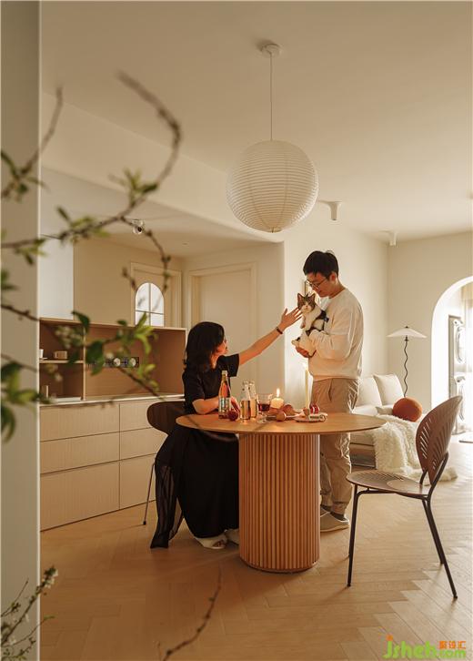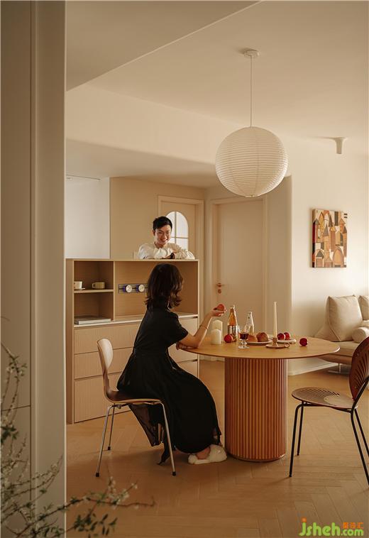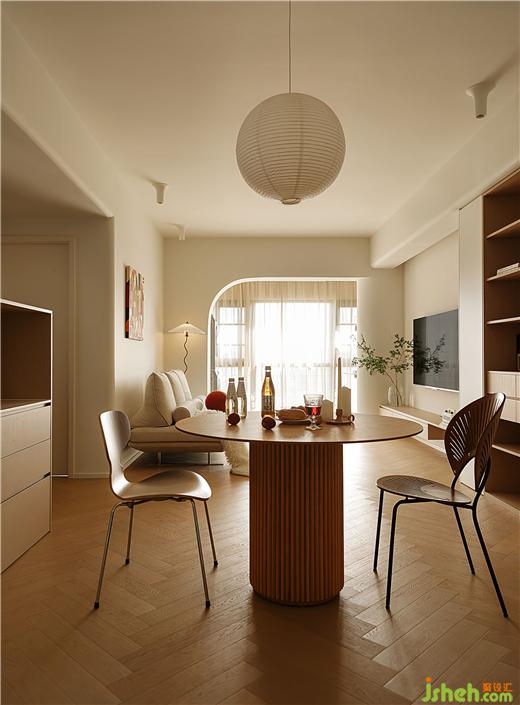 餐廳:原廚房門移位空間留給餐廳,星海名城家居設計拆掉與次臥之間的墻變成開放式,增設餐邊柜臺,更具使用性,也讓空間感得到延伸
