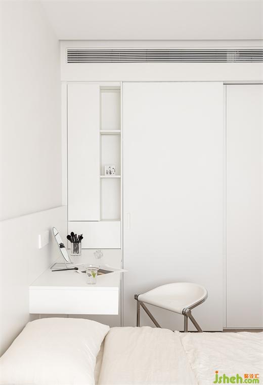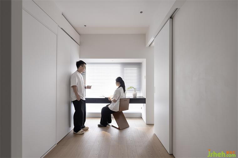 3、次臥兩側(cè)墻體拆改為開合自由的移門,動線自由,空間感得到最大限度延伸,移除室內(nèi)飄窗改為書桌,靠墻高柜嵌入墨菲床,滿足臨時留宿,次臥功能復(fù)合,利用率最大化。