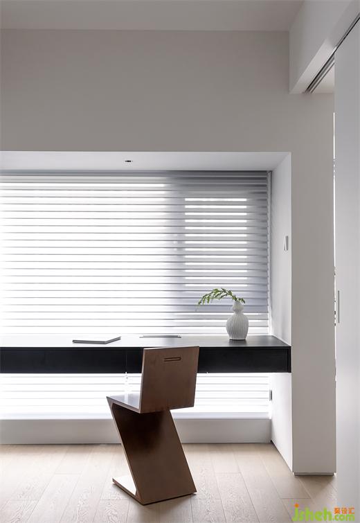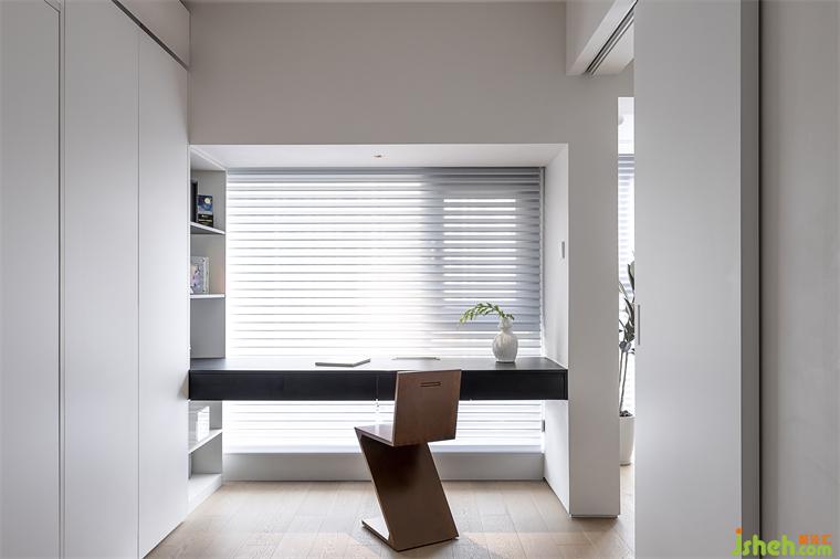 屋主的父母偶來短住,靠墻高柜嵌入墨菲床,放下即可充當臨時客房。房內(nèi)飄窗移除,改為抽屜書桌,并配以對應(yīng)開放格書架和Z型椅,構(gòu)建舒適工作區(qū)。#書房#墨菲床#書桌