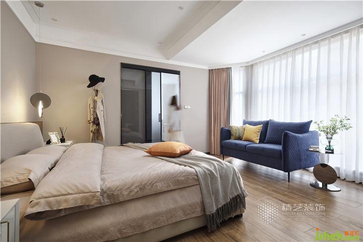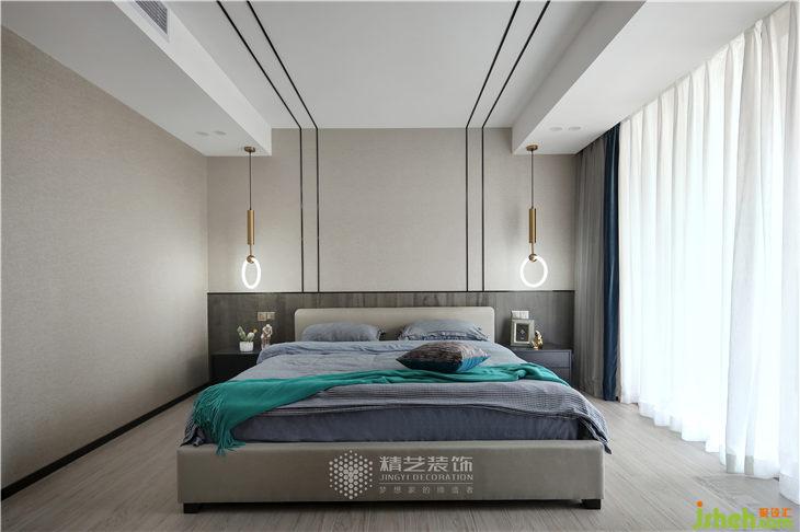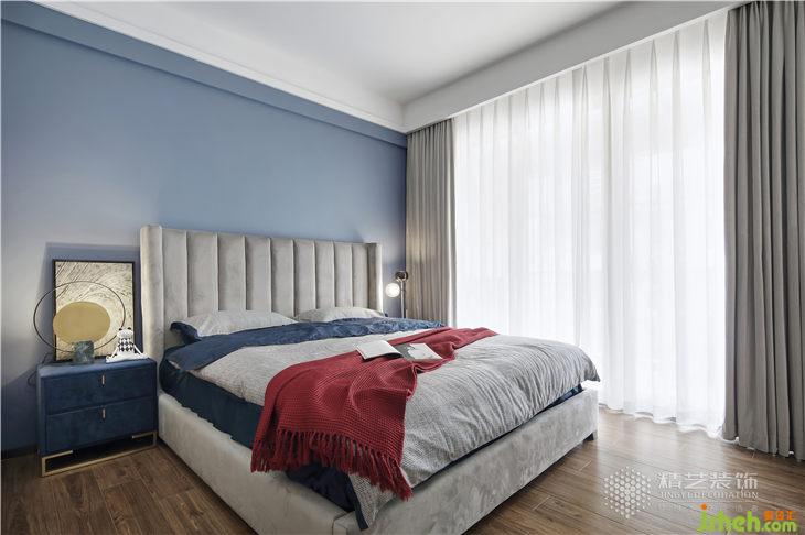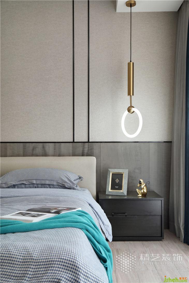 主臥里的雙色窗簾,為空間增添了精致的小心思,黃色的抱枕起到很好的點睛作用,都會給人暖融融的感覺。床頭懸掛鏡面吊燈與藍色沙發(fā)旁金屬角幾相襯托,不僅可以增加空間視覺延伸,打造優(yōu)雅溫馨的宜居之境。