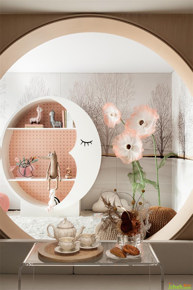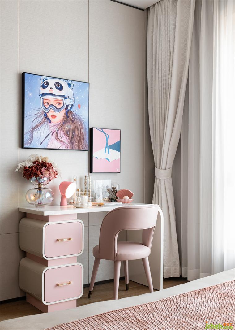 女主人空間在沙發(fā)背景植入玻璃屏風如點睛之筆,空間的風雅意蘊鋪滿,傳遞出現代與中式氣韻,樣板房設計營造了自洽怡然的居家氛圍。