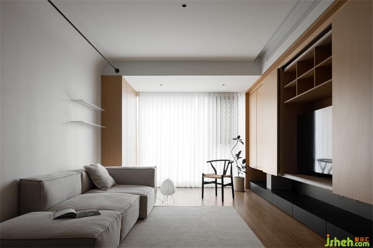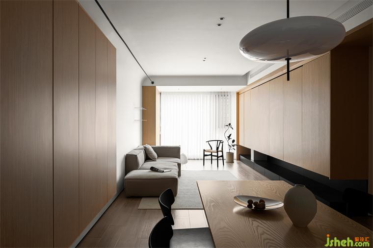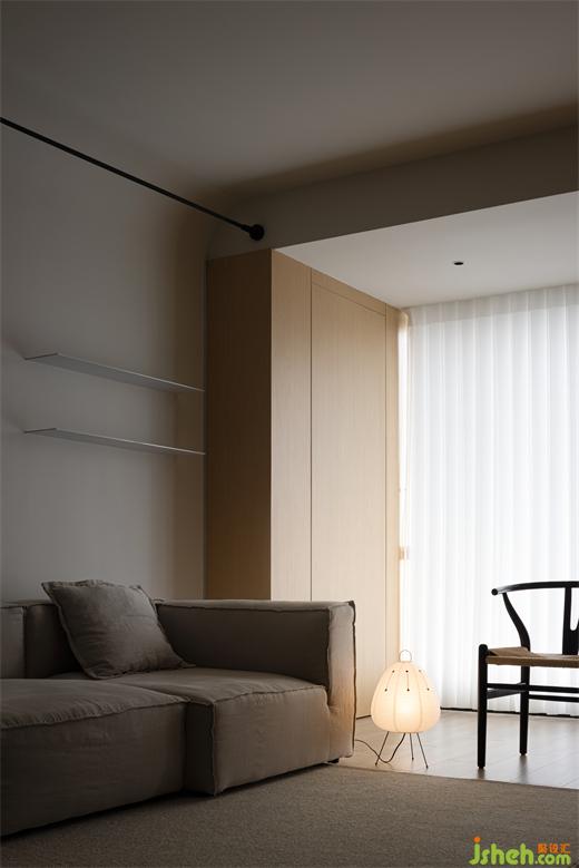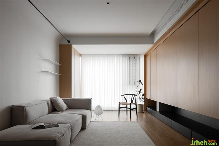 木作為造房子傳承下來(lái)最基礎(chǔ)的材料,回應(yīng)了樸素與自然,裝修設(shè)計(jì)而原木與陽(yáng)光是整體空間節(jié)奏的連接。為了讓視覺(jué)上有更好的體驗(yàn),我們將陽(yáng)臺(tái)與客廳合并,保持穿透外也讓客廳空間更顯大。