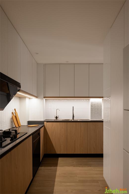 將廚房與生活陽臺合并后有了更長更寬的操作臺面,在臺面上我們也設計了高低臺,裝修設計讓屋主切菜與炒菜時有更舒適的姿勢,更自在的操作。