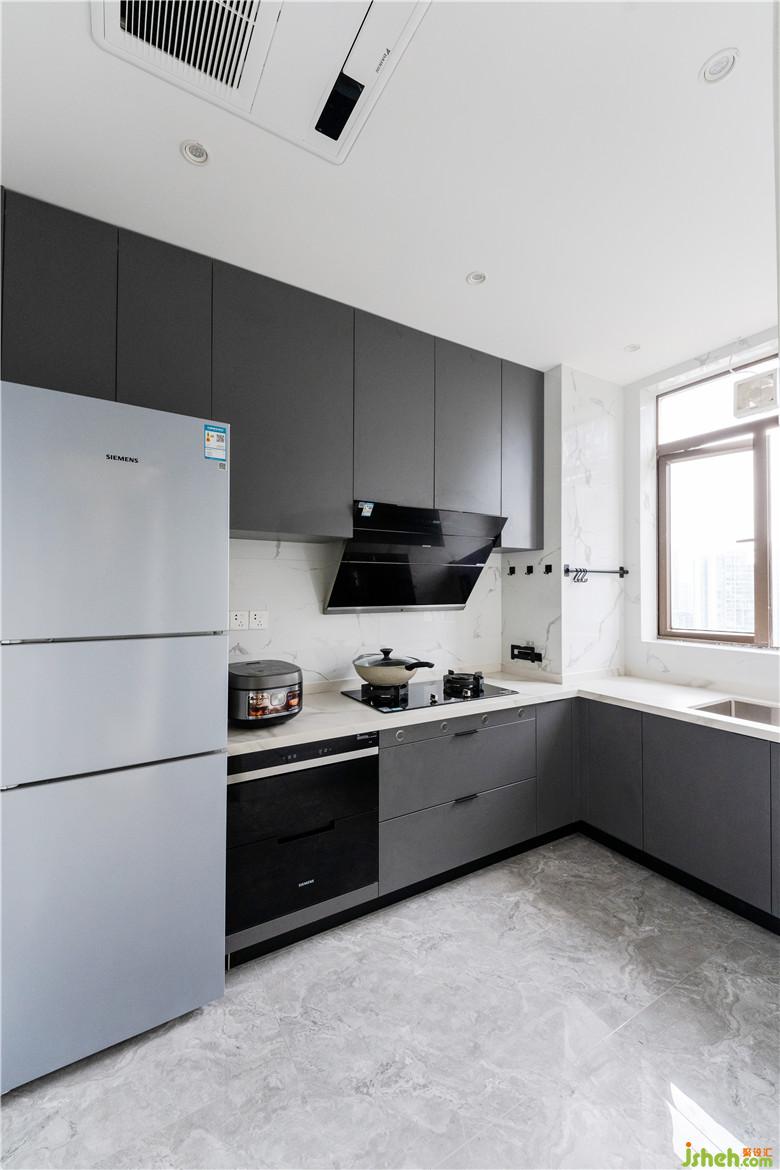 廚房基本上被承重墻包圍住,所以難以改動,維持L字型格局,那我們就從材質(zhì)上做改變,以灰調(diào)與外邊的空間形成呼應(yīng),讓整體更加的連貫。