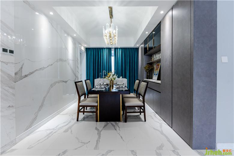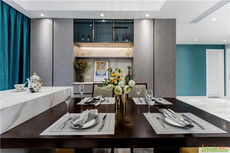 要說起整個空間Johnny最喜歡的是哪個區(qū)域,那定是餐廳空間區(qū)域。餐廳的島臺設(shè)計盡顯大戶型的大氣時尚,依舊使用大理石材質(zhì)作為呼應(yīng),餐邊柜選用了愛格板水泥紋理的柜門板,灰色調(diào)的柜子與窗簾綠色墻面的綠色碰撞,不自覺間產(chǎn)生一種高級感。