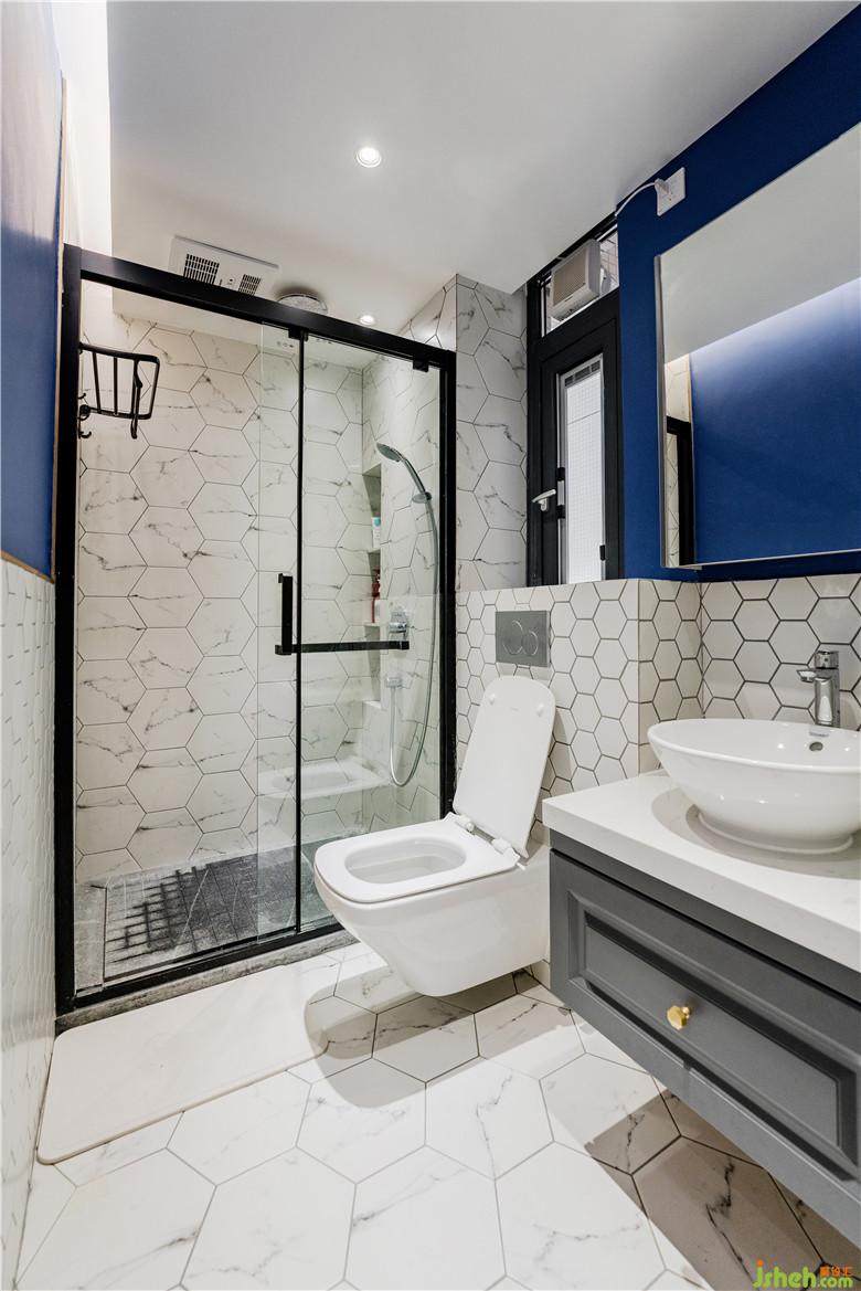 衛(wèi)生間異?;钴S有木有!區(qū)別以往的衛(wèi)生間,Johnny哥用大色塊藍(lán)色調(diào)去提亮衛(wèi)生間,腰線以上是藍(lán)色腰線一下式六角磚鋪貼,莫名的復(fù)古feel。入墻式排水的馬桶上方還可以放置小物件呢!雖說整個衛(wèi)生間空間都是六角磚,但是干濕分區(qū)用的是兩種尺寸規(guī)格的六角磚,無形中就區(qū)分開來了。