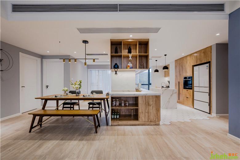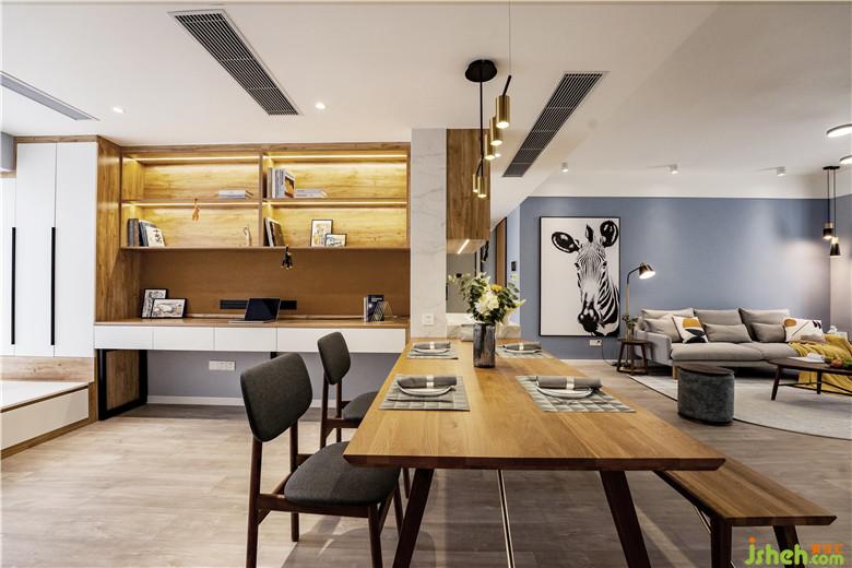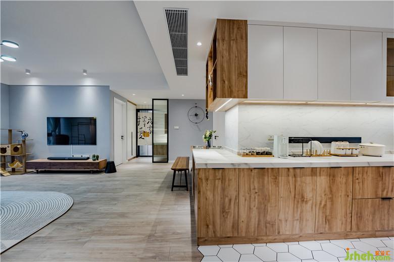 沙發(fā)背景墻與電視背景墻都是用的多樂士墻漆,當時設計師選色號也挑了蠻久的,畢竟太深會顯得壓抑太淺突出不了感覺,現在兩面墻面的顏色剛剛好于霧霾藍與天空藍之間,倆顏色相互襯托相互對比,這樣一來層次感就出來了。從這個角度也是全屋最佳哦,放眼望去便能看到這全屋結構走向,開放式的廚房與餐廳共同造就客餐廚一體化設計。