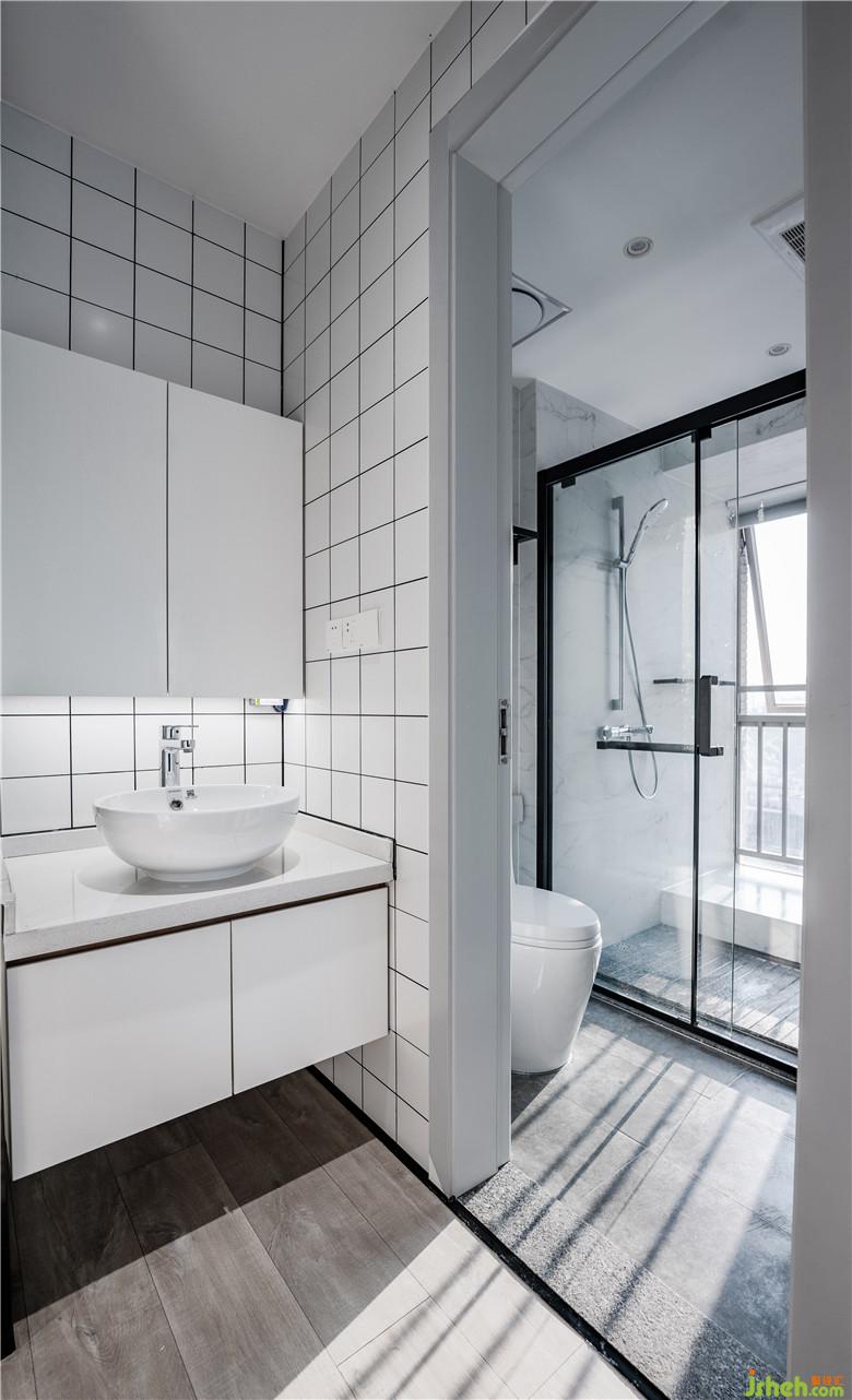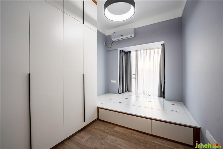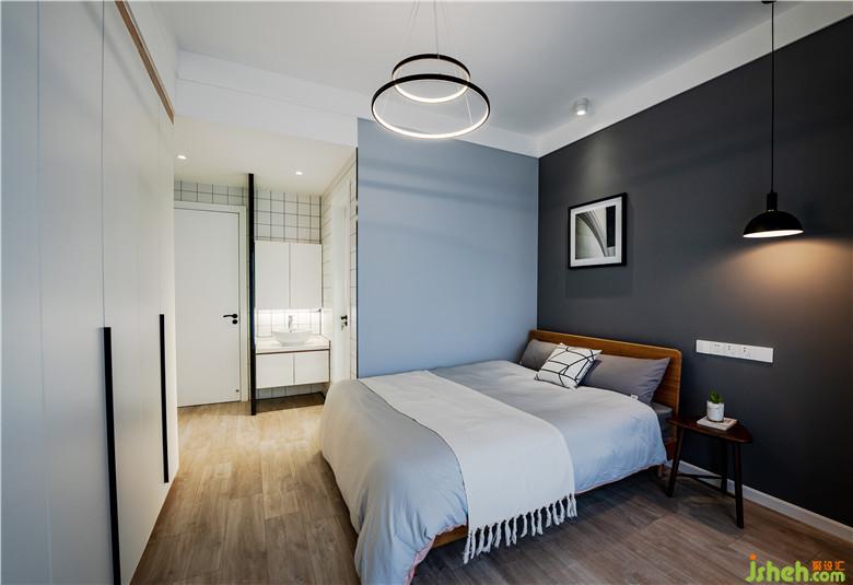 次臥。Johnny哥希望能給到業(yè)主無限舒適感,所以次臥的衛(wèi)生間也是采用干濕分離,將洗漱區(qū)獨立開來。墻面藍灰撞色、小方磚的運用讓房間的北歐風情更充足。胡桃木色的原木家具,搭配白色到頂大衣柜可以將儲物功能發(fā)揮到最大,也不留衛(wèi)生死角。打造安眠空間,靜謐而自在。