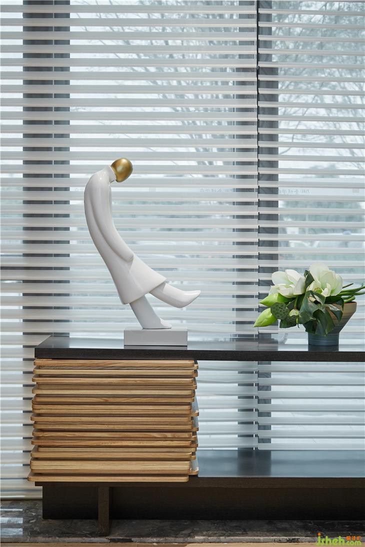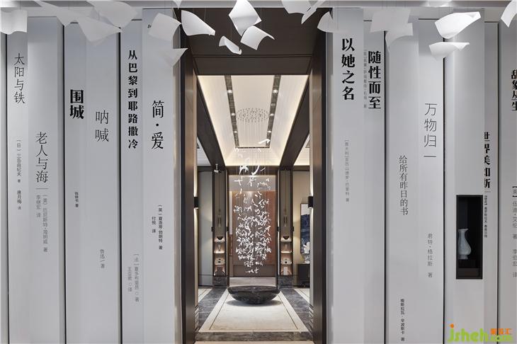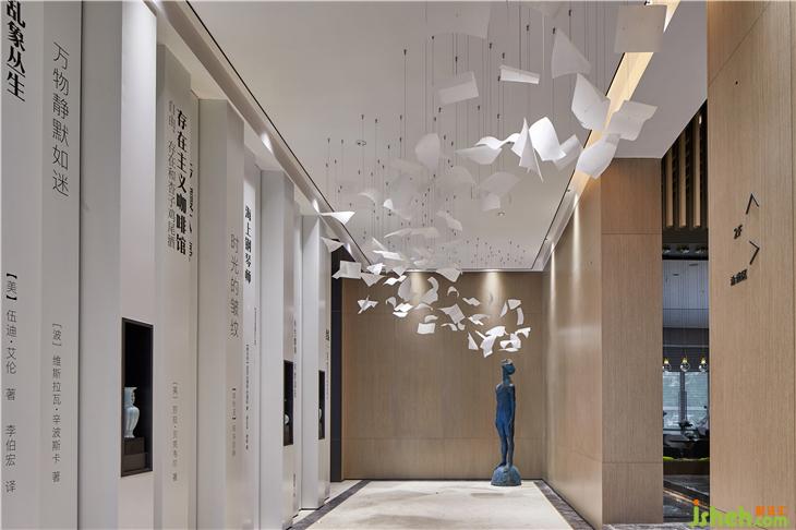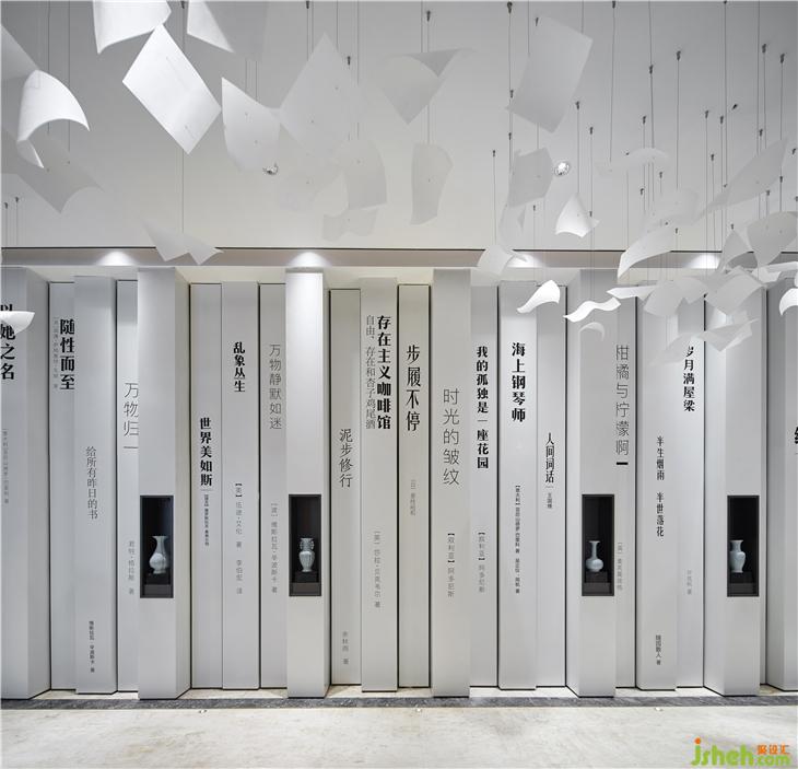 設(shè)計(jì)師通過對空間設(shè)計(jì)的升級,為這個售樓處打造了一個具有辨識度的藝術(shù)長廊,高三米八的書墻,以夸張的表現(xiàn)手法,營造出素雅靜逸的書苑氛圍。于書墻中嵌入裝飾柜,放置的白瓷花瓶,卻有“書中自有顏如玉”的既視感。