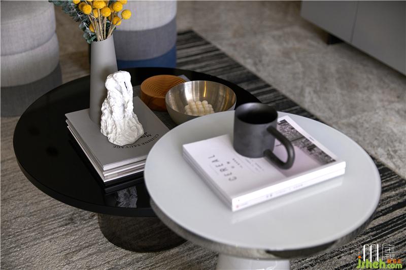 客廳以高級(jí)灰作為打底,灰色屬于明度高的冷色相,設(shè)計(jì)師巧用顏色的后退感讓空間看起來更加開闊,呈現(xiàn)出“濃妝淡抹總相宜”的包容性。低飽和度的牛仔藍(lán)散發(fā)摩登的氣息,活潑的檸檬黃則提亮了整個(gè)客廳的妝容。