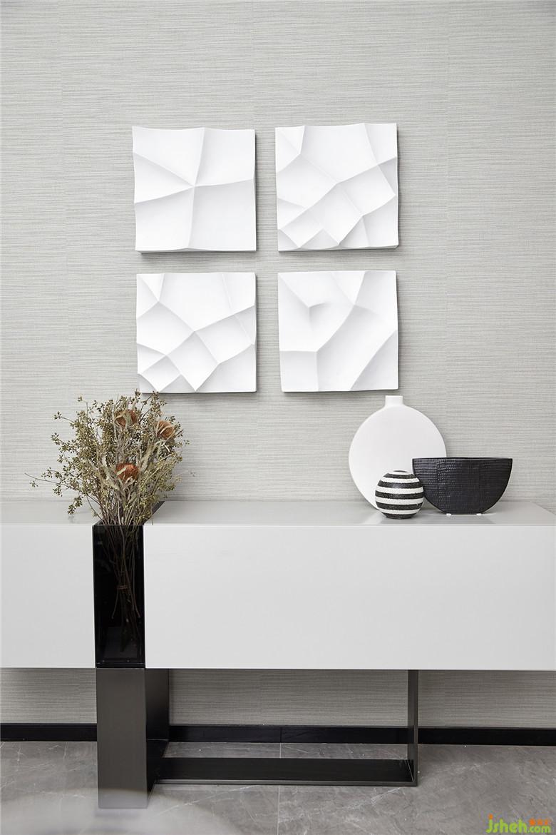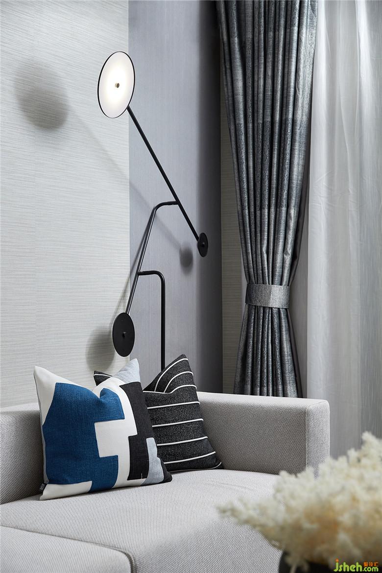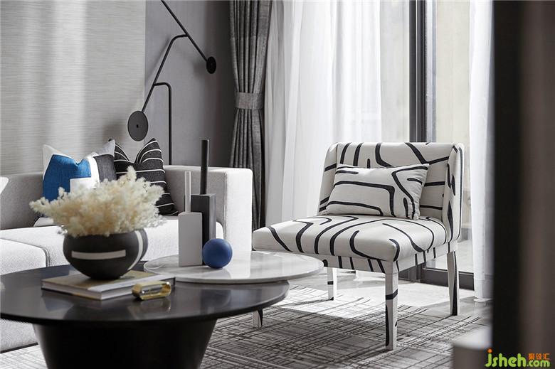 如果說客廳空間的設計相對收斂了個性的表達,主臥則在家具與飾品的選擇上,將時尚氣息充分地釋放出來。吊燈的陶瓷質感、靠墊的條紋延伸了客廳的風格,一幅吸睛的裝飾畫,把我們的思緒拉回當下,感受安靜的力量。