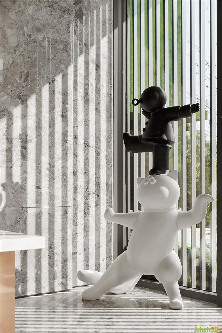 在落地窗的一角,出其不意的放置了一座Q版雕塑,為這個板正的空間增添了趣味性和活力。