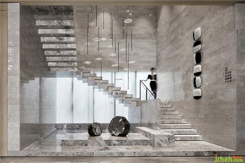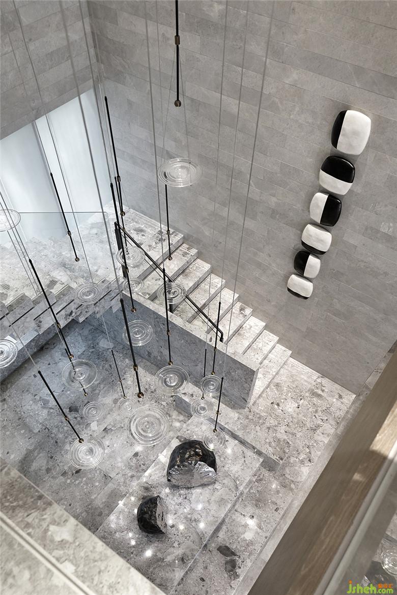 在樓梯水景區(qū),與自然融合的意境被巧妙地藏在了這里。吊燈的靈感來源于雨滴落下激起的漣漪,從水平方向上看不出端倪,但從高處往下看,仿佛真有漣漪在空氣中暈開,化成了清靈之感。