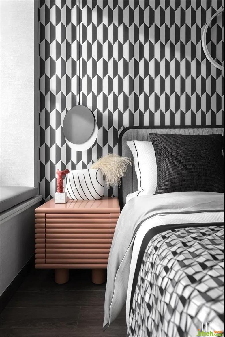 暗沉中見明亮的驚喜延續(xù)到主臥的調色板中,黑白線條和不規(guī)則色塊的組合闡述多元個性。墻上掛飾和陶藝的圓形元素的加入,豐富了設計的幾何空間感。人偶造型的臺燈、陶藝和植物在床頭以及飄窗上建起浮生偷閑的一方樂園,如同置身世外桃源般,遠離喧嘩鬧市的塵埃,寧靜而舒適。