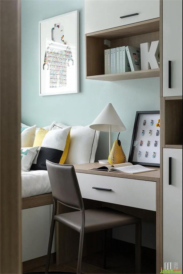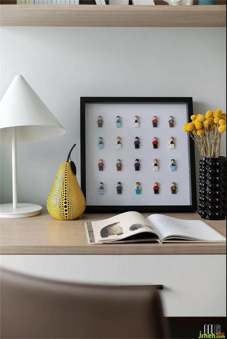 從墻面掛畫到桌上飾品,象征著智慧的樂高帶著兒童在房間里四處探尋。素凈的主題色在黃色的明亮中張揚(yáng)獨(dú)特個(gè)性,突出鮮明時(shí)尚感。在色彩對比中,張揚(yáng)創(chuàng)新個(gè)性,渲染炫酷時(shí)尚的空間氛圍。