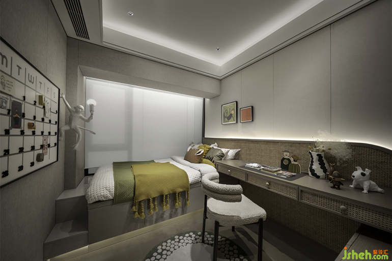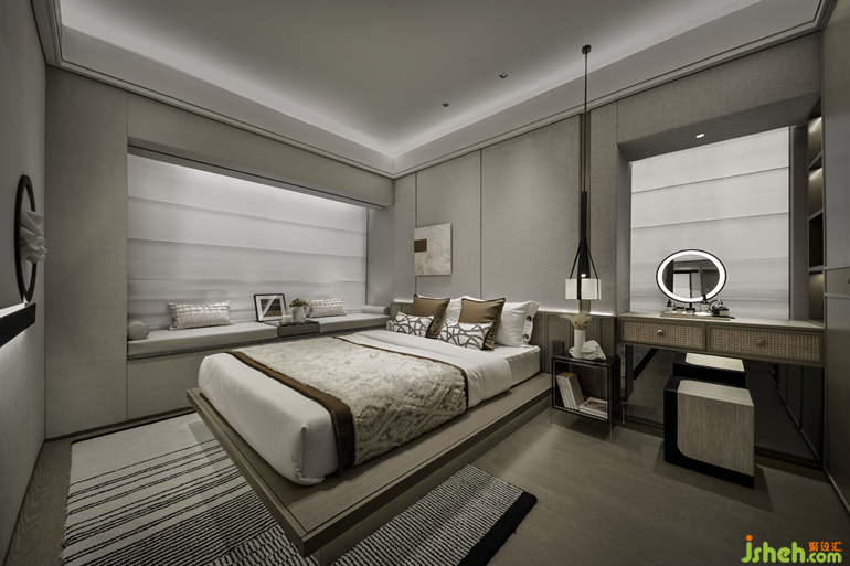 建面72㎡的空間,規(guī)劃設(shè)置了2+1房,且每個(gè)房間皆擁有舒適的空間尺度。在樣板房設(shè)計(jì)策略上,極致利用6處飄窗承載儲物,最大限度地將功能空間釋放出來,并賦予空間多元復(fù)合的功能屬性。在視覺的呈現(xiàn)上通過利用鏡面玻璃將空間放大、延長,家具則盡量做低或選擇“矮”規(guī)格形式,樣板房設(shè)計(jì)以營造高、闊的空間視覺效果。