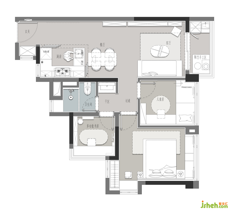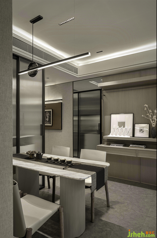 投影式電視背景墻,既符合當(dāng)下年輕人的生活方式,亦釋放了更多的空間。每個(gè)空間的使用機(jī)能不予以明確的定義,借以開(kāi)啟更多的生活可能:樣板房設(shè)計(jì)客廳既可作為全家人觀影娛樂(lè)、休閑放松的區(qū)域,電視柜亦可作為書(shū)桌、書(shū)臺(tái)使用,亦或是日常做陶藝手工的開(kāi)放式工作區(qū);餐廳亦不只是承載用餐的功能,茶具一鋪,這里便成了一個(gè)別致的會(huì)客空間......設(shè)計(jì)師帶著對(duì)時(shí)代生活纖細(xì)化的感知,以靈活性的布設(shè),引導(dǎo)居者自如切換更豐富多樣的生活方式。