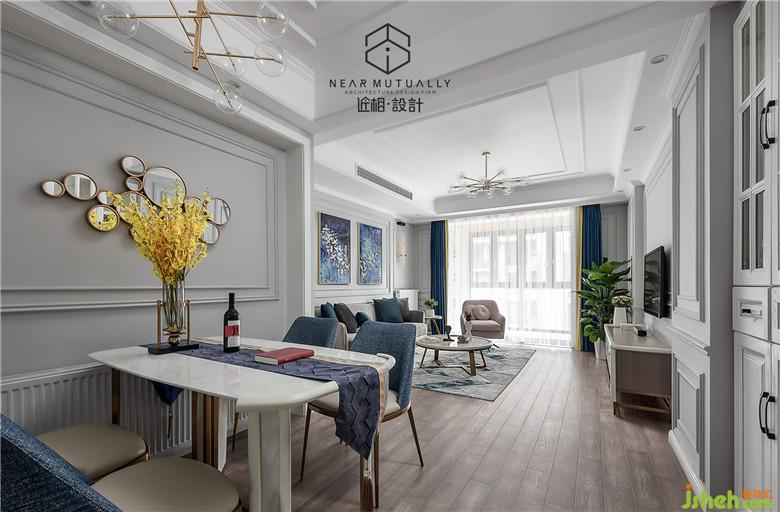 公共區(qū)域的挑色選擇的是藍(lán)色和黃色,因?yàn)槭覂?nèi)設(shè)計(jì)師和業(yè)主都很喜歡藍(lán)色,所以再裝飾畫,軟配的選擇上不默而合,很快的就確定下來。