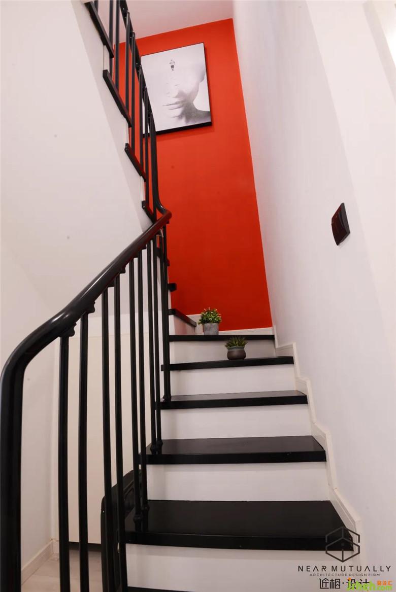 樓梯間用大紅色做出跳色,裝修公司讓簡單的空間有更多的視覺可能,與樓下背景墻產(chǎn)生對比,跳出了傳統(tǒng)極簡的冷色調(diào)。