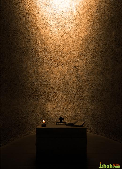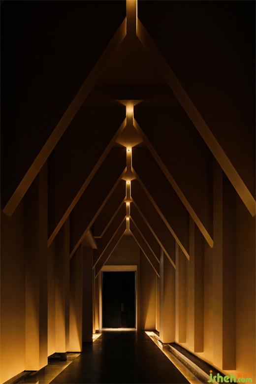 由此,落筆場(chǎng)域氛圍的營(yíng)造,設(shè)計(jì)師以建筑美學(xué)為基底,取意于柯布西耶的朗香教堂。獨(dú)特的架構(gòu)形式,突破傳統(tǒng)平鋪直敘的塊面,以不規(guī)則的墻體形態(tài)與洞口切割形式展開,指向于人對(duì)空間的深層探索。