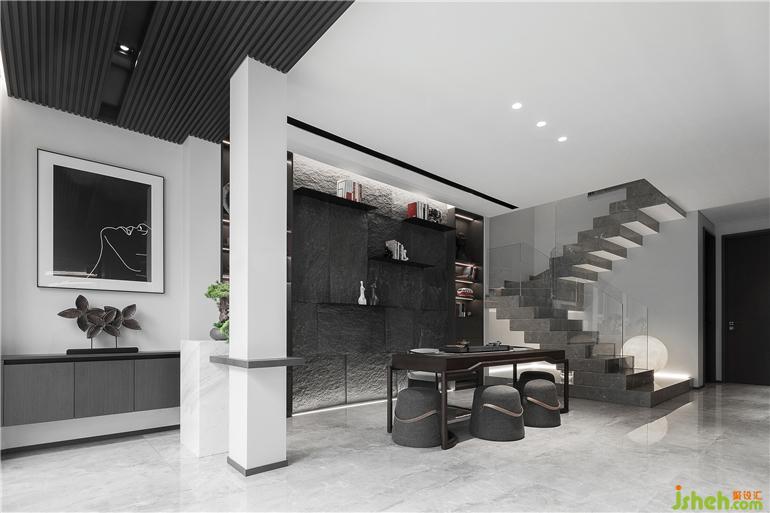 每一處空間細(xì)節(jié),都應(yīng)以人為本出發(fā),關(guān)照體驗(yàn)者的體驗(yàn),真正為生活而公館設(shè)計(jì)。質(zhì)樸自然的茶室空間,營(yíng)造著這座城市中的慢生活,為人的心靈留得一處理想的休憩之所。原始的巖石肌理、厚重的體塊構(gòu)造,設(shè)計(jì)在平靜而克制的基調(diào)中,刻畫(huà)清新脫俗的空間氣息,喚醒人心中的安寧與平靜。而與茶室空間相連接的外部庭院,可以是一家人放松休閑的棲息地,亦可以是好友聚會(huì)的娛樂(lè)空間......這里延續(xù)著生活的高品質(zhì)體驗(yàn),為平凡的日常注入了嶄新的生命力。每個(gè)人心中都有著對(duì)于家的不同理解,在整體簡(jiǎn)約純粹的基調(diào)中,整體空間以簡(jiǎn)白與深棕兩種色調(diào),鋪敘空間至簡(jiǎn)的美學(xué)氛圍。